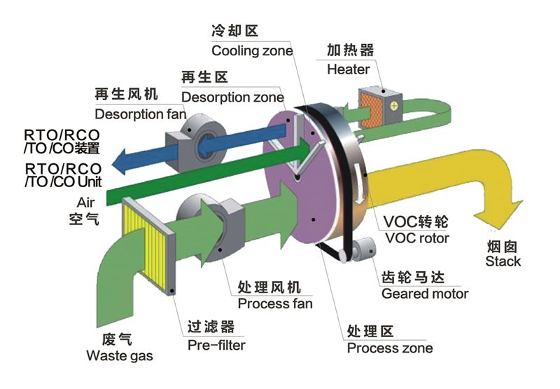 吸附濃縮處理技術(shù)是將吸附濃縮與氧化技術(shù)(包括R TO、RCO、CO) 組合在一起的VOCs治理技術(shù)。吸附濃縮以沸石分子篩或蜂窩活性炭作為吸附材料,以轉(zhuǎn)輪或固定床作為吸附裝置,將大風量、低濃度的VOCs廢氣轉(zhuǎn)化成小風量、中高濃度的廢氣。