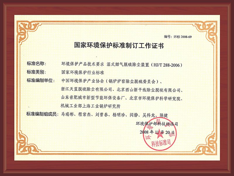 2008年國家環境保護標準制定工作證書