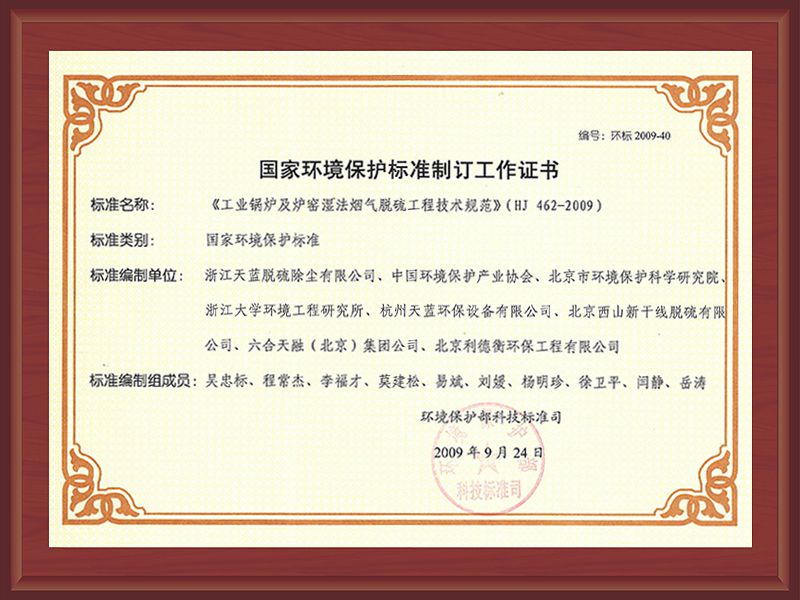 2009年國家環境保護標準制定工作證書